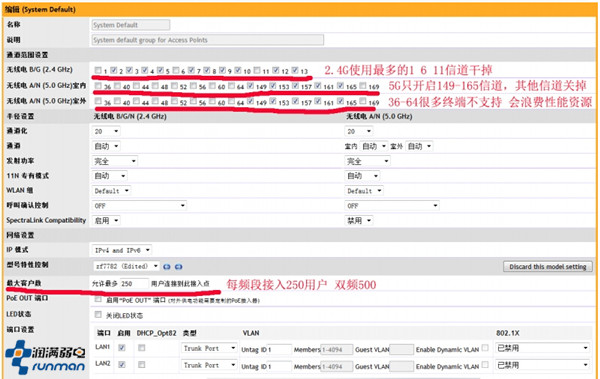 3、關(guān)閉特定無線AP的2.4Ghz、開啟CleanAir、開啟信道引導(dǎo)、開啟終端負(fù)載均衡、關(guān)閉2.4Ghz低速率、開啟Fast SSID Change和終端設(shè)備識(shí)別功能。